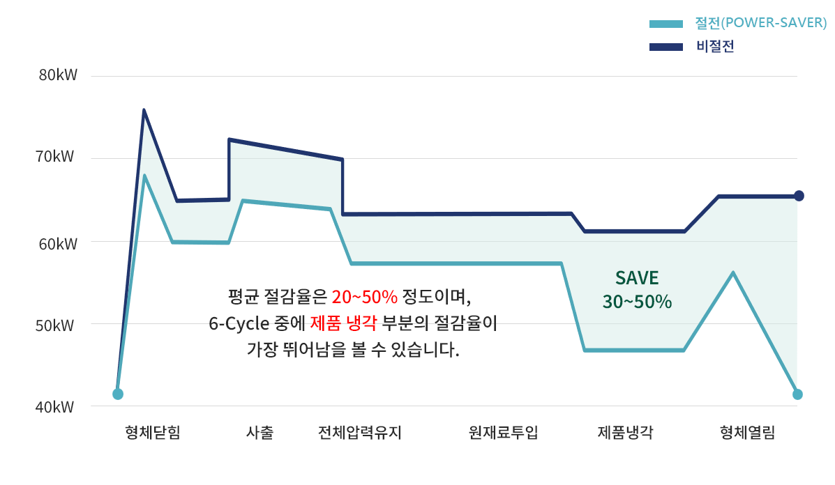 6-Cycle 중에 제품 냉각 부분의 절감율이 가장 뛰어남을 보실 수 있습니다.